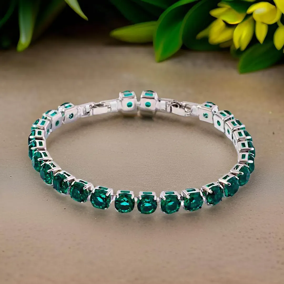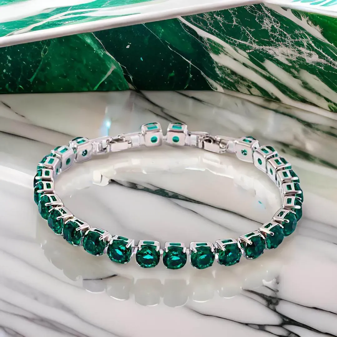 Tento nádherně třpytivý výrazný náramek bohatě zdobený sytě zelenými krystaly s diamantovým brusem dokonale ozdobí každou něžnou ručku. Náramek je možné velmi jednoduše prodloužit či zkrátit díky odnímatelné části. Náramek je vykládán precizně broušenými krystaly Swarovski® a povrchově upraven drahým platinovým kovem - rhodiem, což dodává náramku lesk a luxusní vzhled.