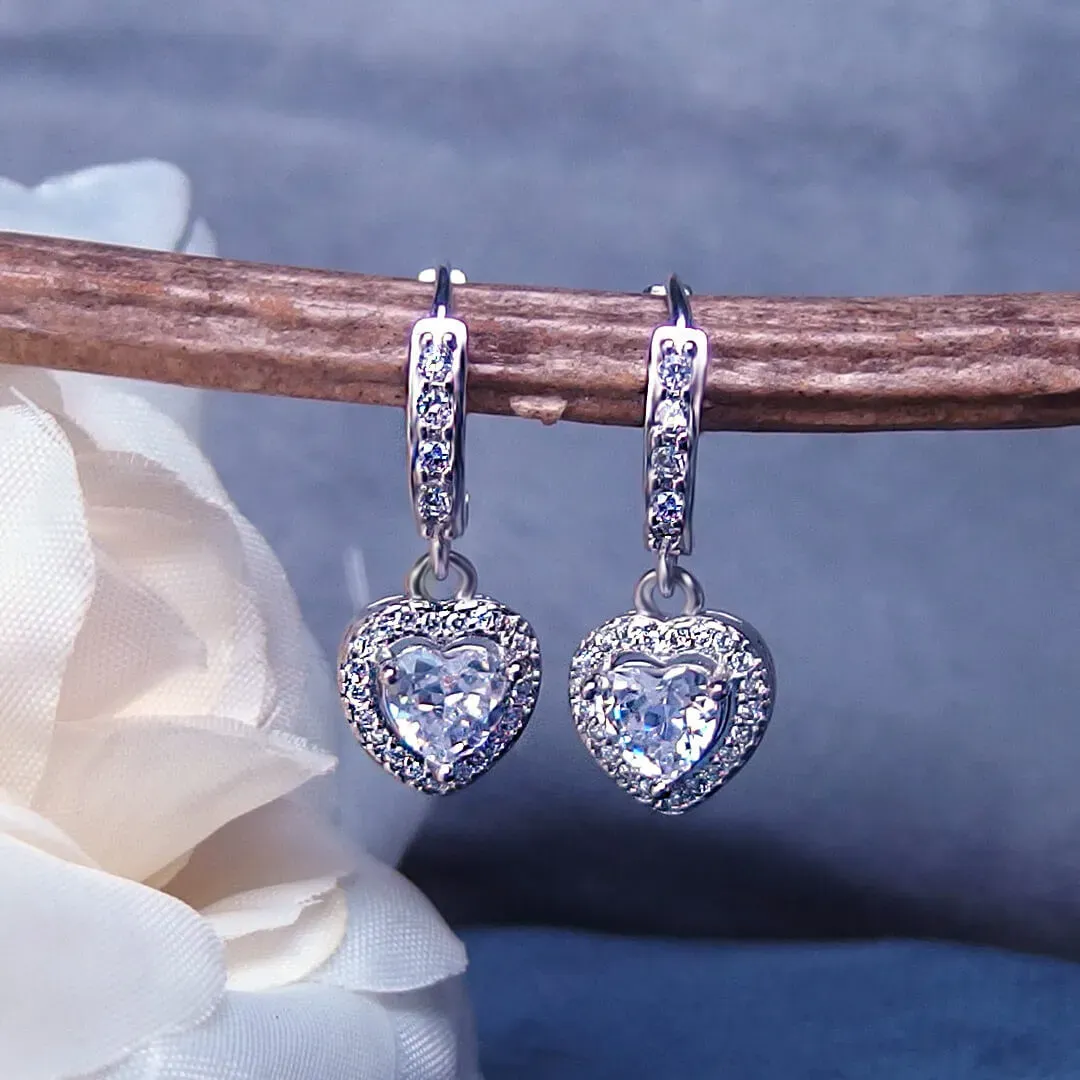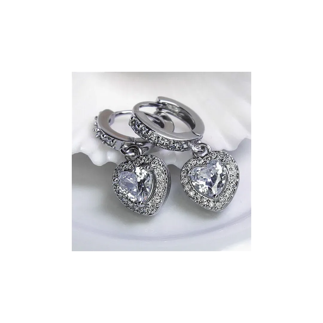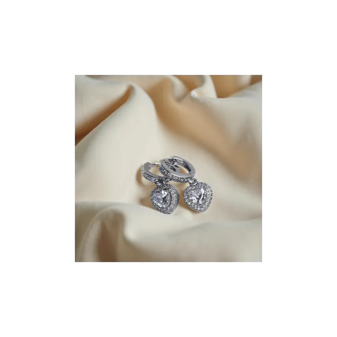 Luxusní romantické náušnice bohatě vykládané třpytivými krystalky s velkým srdcovým krystalem diamantového brusu v krystalovém závěsu pro výjimečnou ženu či dívku. Náušnice jsou bohatě zdobeny kubickými zirkony nejvyší kvality AAA+, na povrchu jsou potaženy platinovým kovem - rhodiem, což jim dodává jedinečný lesk a svůdnou barvu bílého zlata.