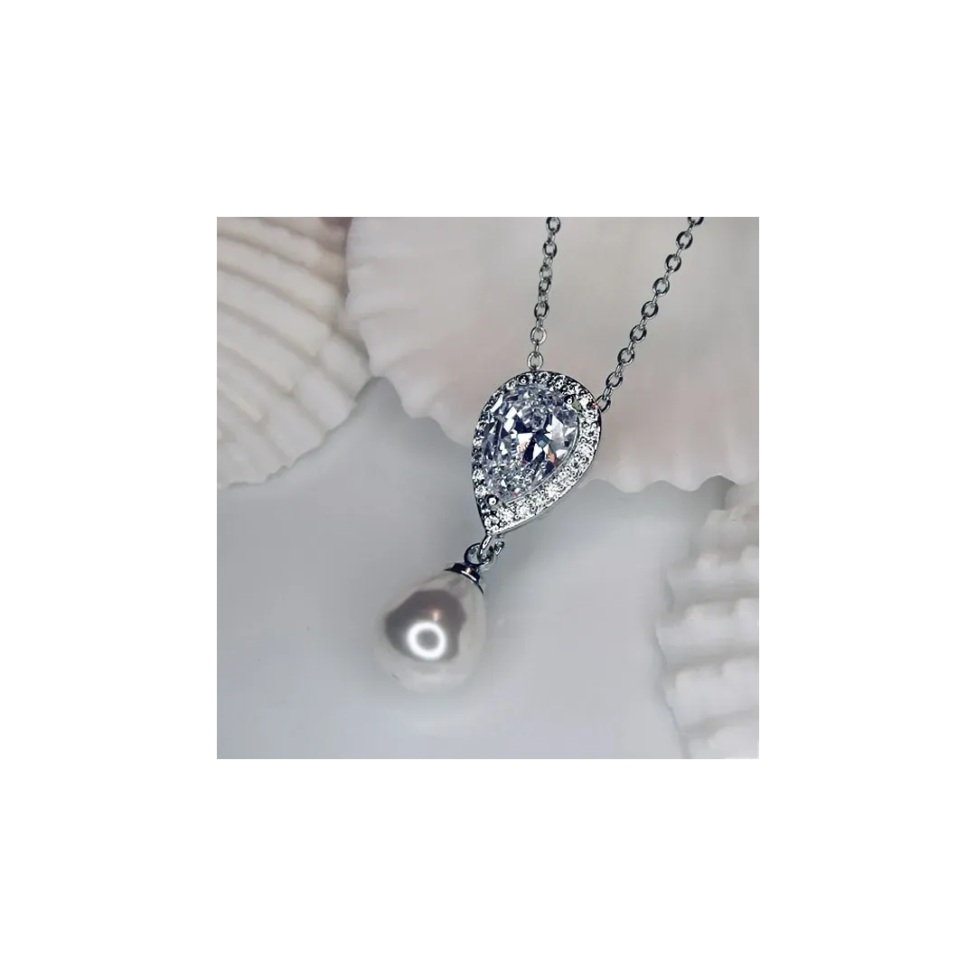 Okouzlující perlový náhrdelník, kterému dominuje velká perla v závěsu vykládaném třpytivými krystaly diamantového brusu. Spolu se stejnojmennými náušnicemi vytvoří dokonalý set. Náhrdelník je precizně vykládaný broušenými kubickými zirkony švýcarské kvality AAA+, na povrchu je potažen drahým platinovým kovem – rhodiem.